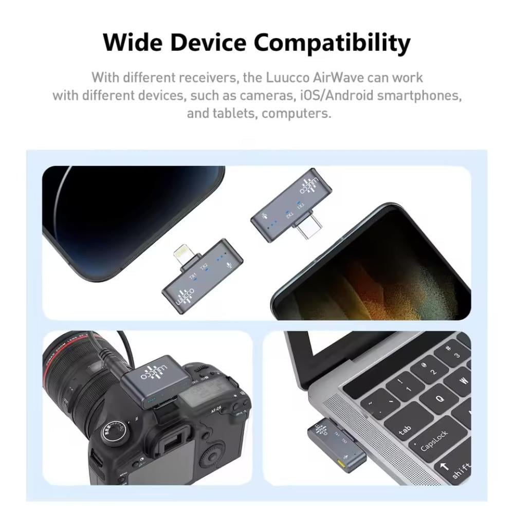 مايكروفون لاسلكي AirWave-K2 combo من LUICCO بتصميم صغير وسلس وموصفات تقنية مميزة يضمن لك عزل صوتي ووضح متناهي مع خاصية التثبيت بالمغناطيس لسهولة التثبيت والاستخدام متوافق مع اجهزة الجوال بجميع الانظمة ومع كاميرات التصوير واجهزة التسجيل يدعم مداخل 3.5 ولايتنق وتايب سي